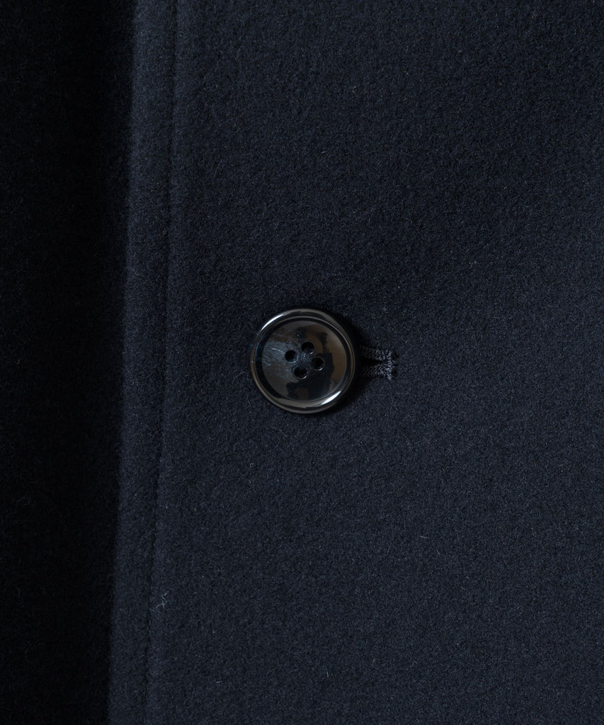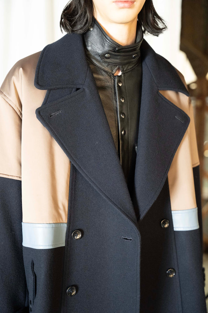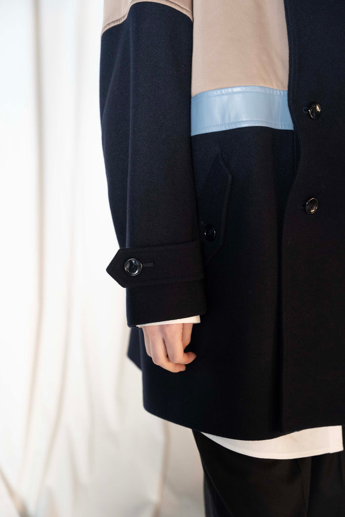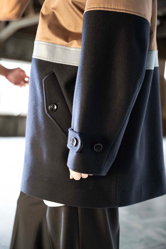 クラシックなピーコートに、パデットのディテールをブリコラージュしたデザイン性の高いウールショートコート。