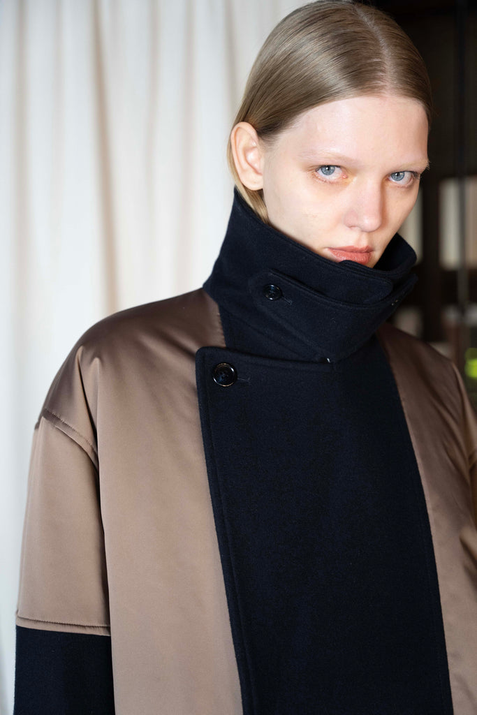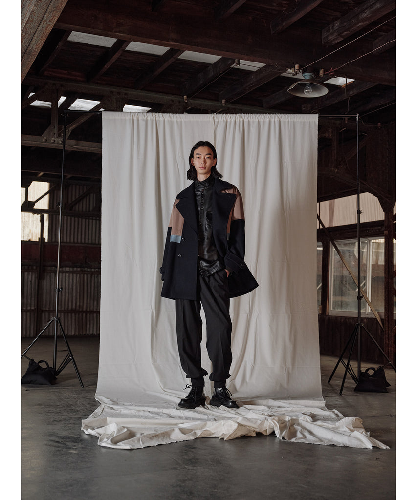 「現代は、未来から見た過去である」という視点のもと、現代の衣服が未来で発掘されるという架空の考古学的アプローチに基づき、デザインを展開しています。 分断された衣服の要素、ウールコートとキルティングコート既存の断片を組み合わせて新たな形を生み出す手法で再構築しています。