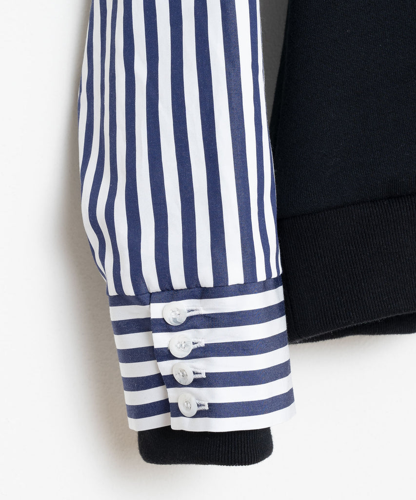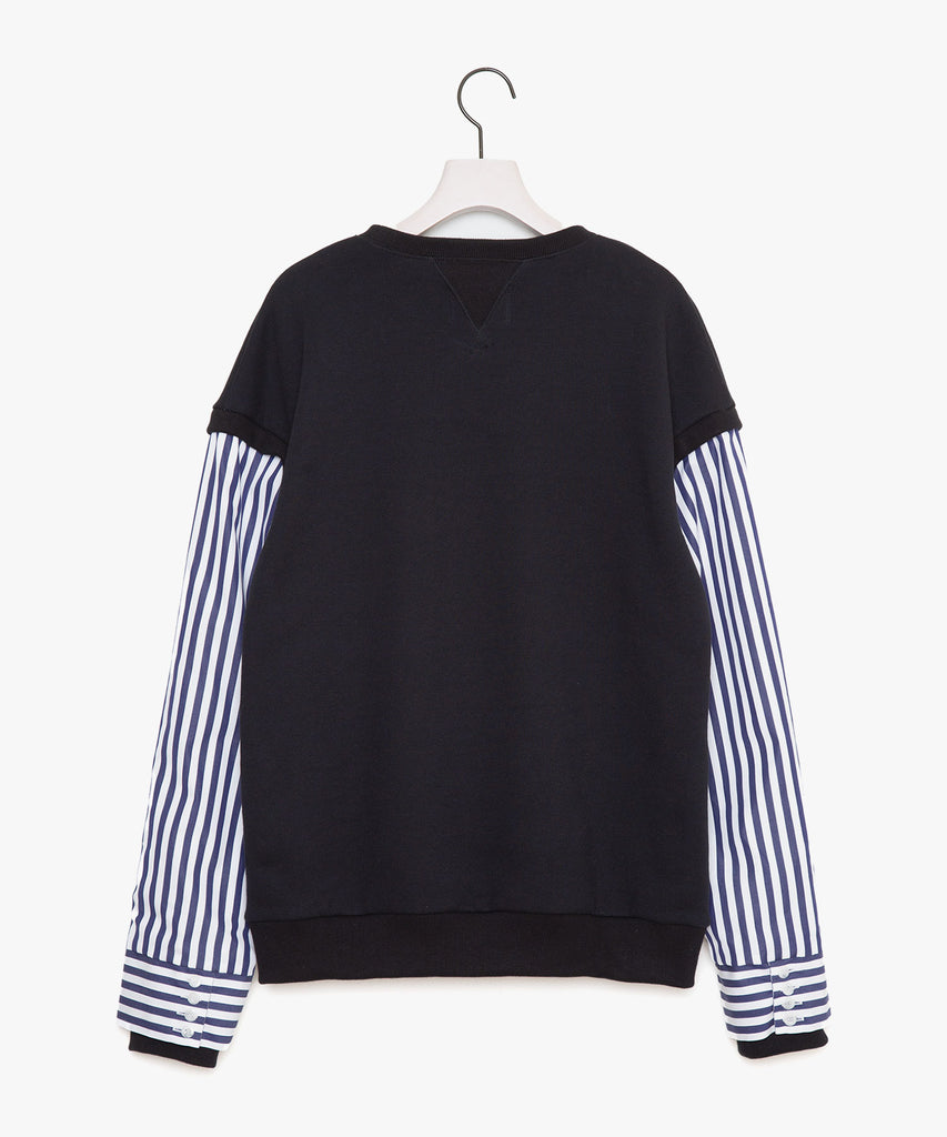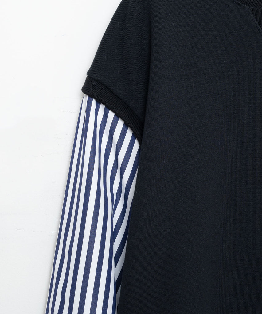カジュアルなスウェットにシャツのディテールを融合させた、ユニークなデザインが特徴の一着。リラックス感のあるスウェット素材のボディに、袖部分にはクラシックなストライプシャツ生地を組み合わせ、異素材のコントラストを際立たせています。袖口にはカフスを施し、さりげなく上品なアクセントをプラス。
