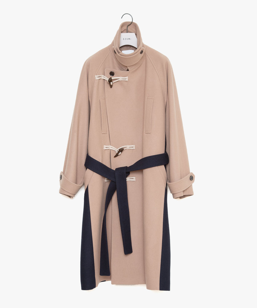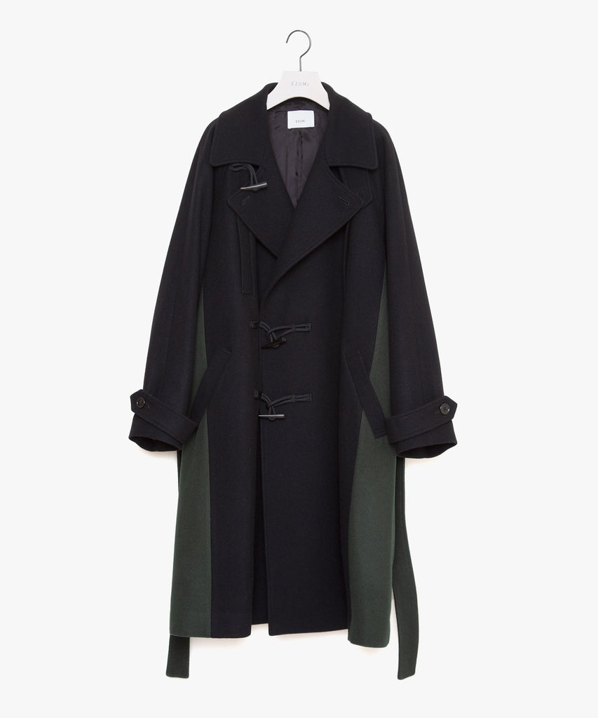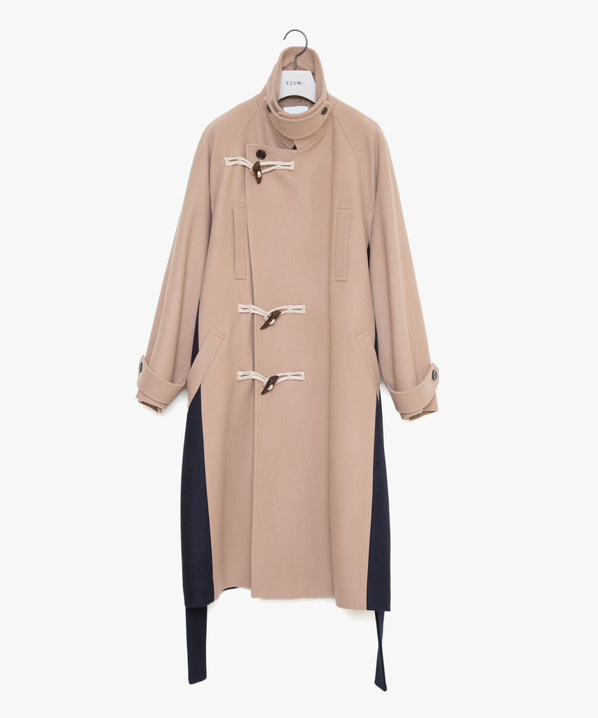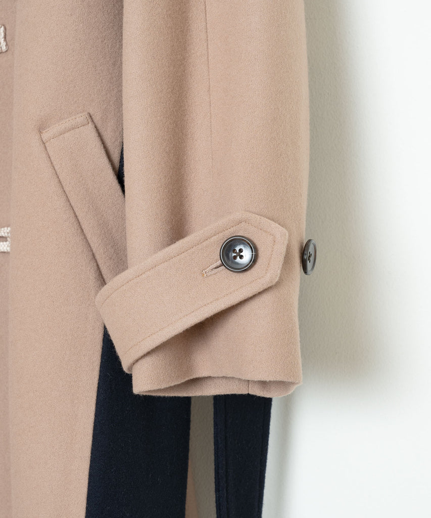 クラシックなダッフルコートとピーコートをブリコラージュしたウールメルトンコートです。