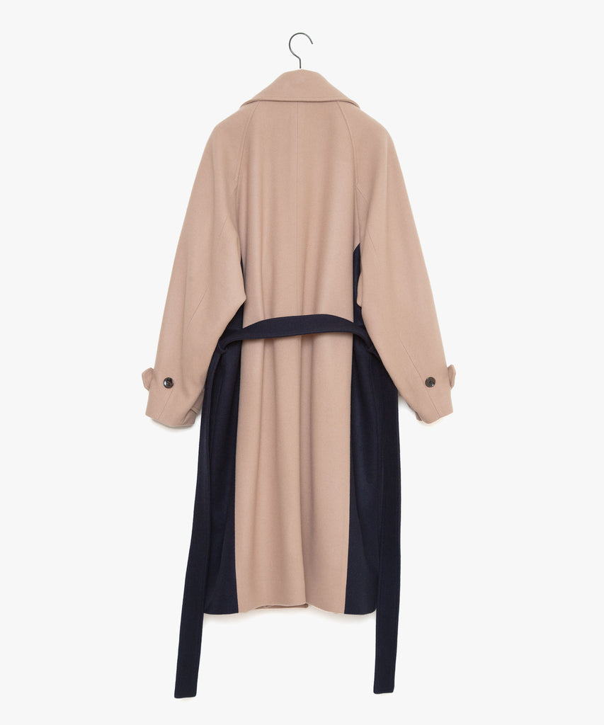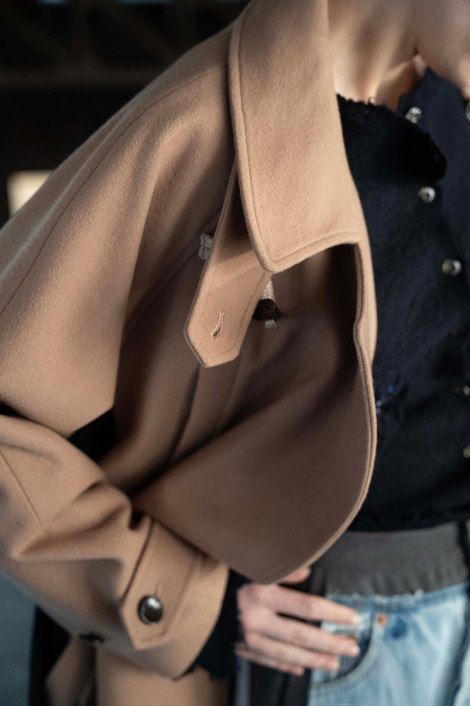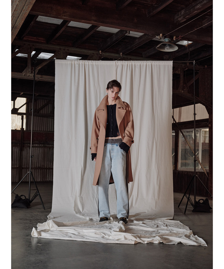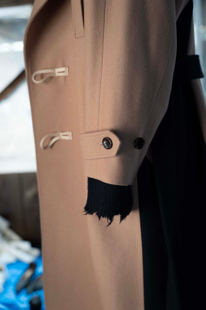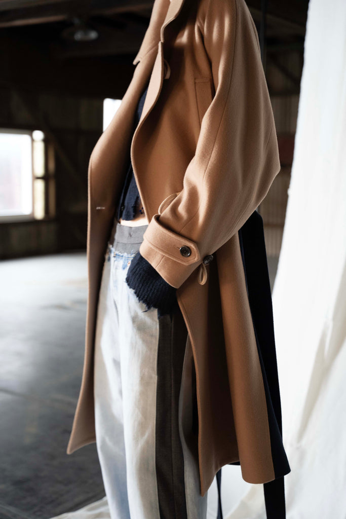 「現代は、未来から見た過去である」という視点のもと、現代の衣服が未来で発掘されるという架空の考古学的アプローチに基づき、デザインを展開しています。 分断された衣服の要素、伝統的なトグル留めをダッフルコートと身頃のディティールはPコートから、既存の断片を組み合わせて新たな形を生み出す手法で再構築しています。脇パネルの配色が視覚的アクセントを生み出し、洗練された現代的アイデンティティを表現しています。 膨らみ感、柔らかさ、上質な風合いが特徴のメルトン素材を使用し、保温性と快適さを兼ね備えています。