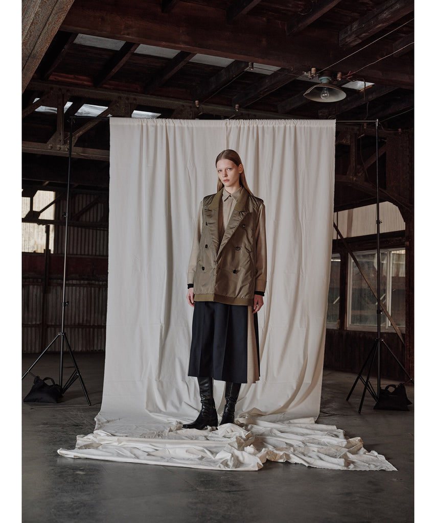 表地は上品なハリと光沢のあるナイロン素材を使用しており、中綿入りの仕様が軽さと保温性を両立し、季節の変わり目にも活躍するアイテムです。