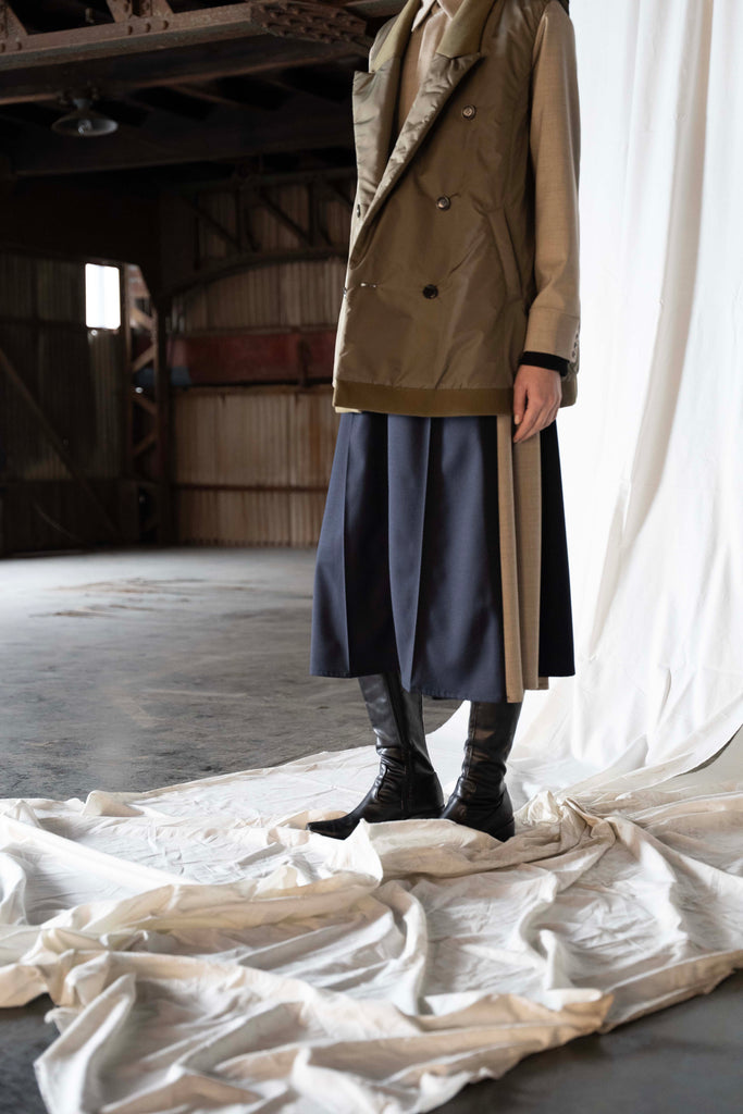 生地は縮絨加工を施すことでウォーム感のある見た目とソフトなタッチを表現したウール混素材を使用。