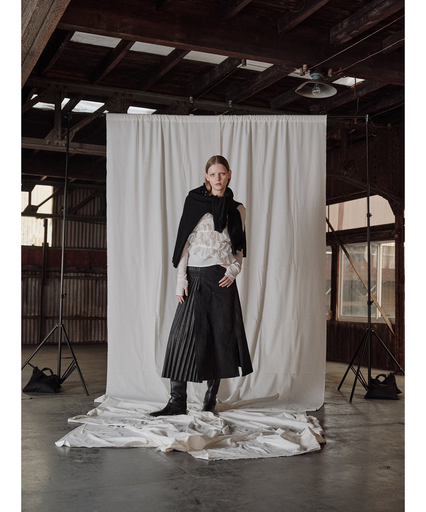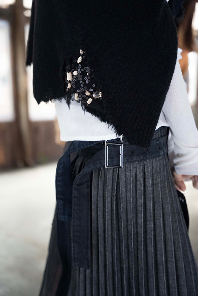 デニムとプリーツの優雅さが調和した、個性豊かな一着に仕上がっています。