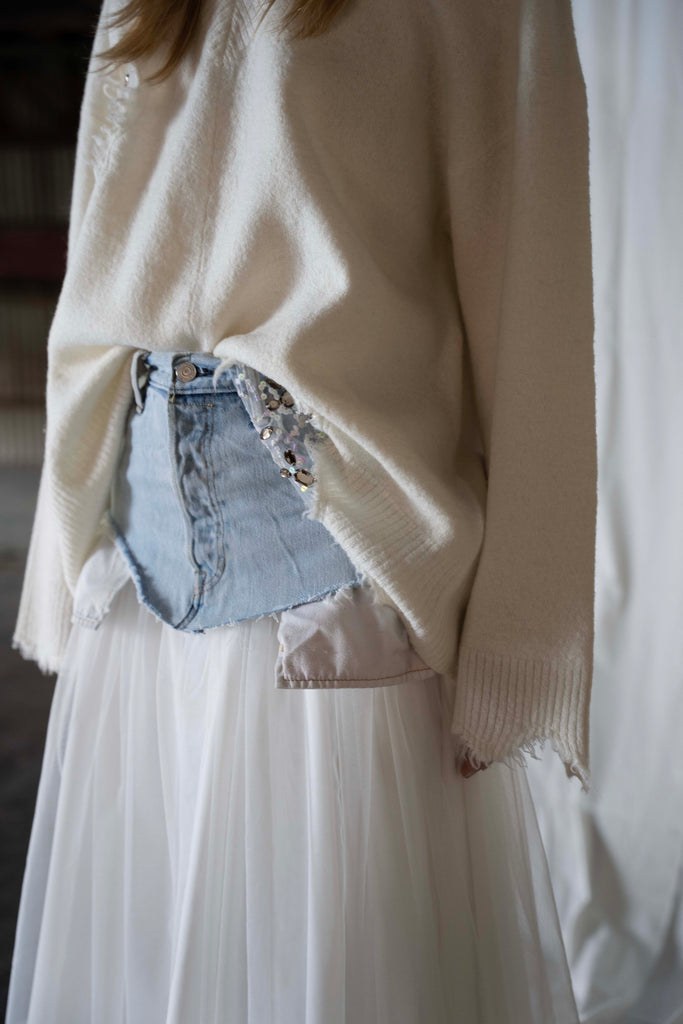 分断された衣服のパーツ、身頃は「リーバイス(LEVI’S)」のジーンズ“501” をベースとしてチュールスカートを組み合わせて新たな形を生み出す手法で再構築しています。クラシック/モダン要素をひとつの衣服に組み合わせることで洗練された現代的アイデンティティを表現しています。
