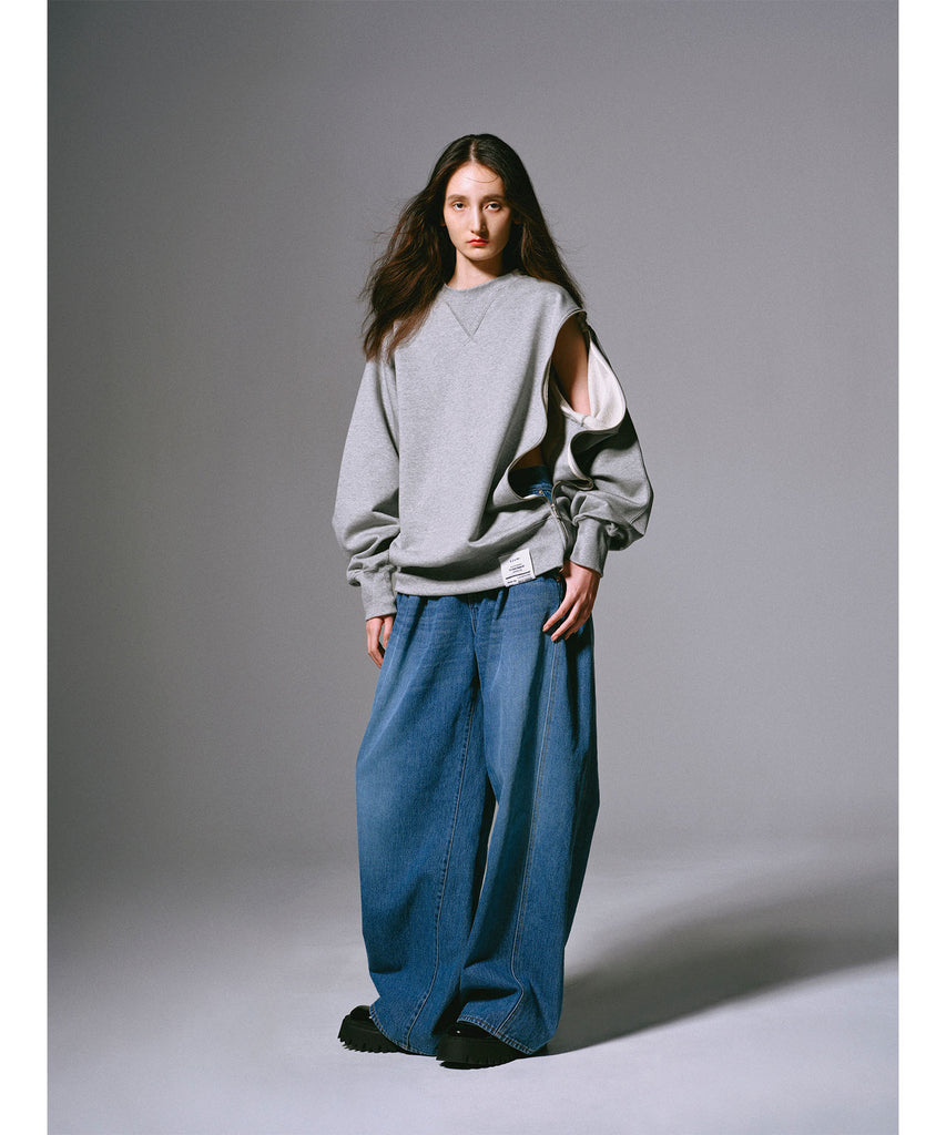 モダンなディテールが光るデニムサイドタックワイドパンツは、25SSのテーマ『風刺的なエレガンス』『真面目にふざける』を反映し、遊び心が詰まった一着です。後ろに配置されたコインポケットディテールがユニークなアクセントとなり、デザインにひねりを加えています。