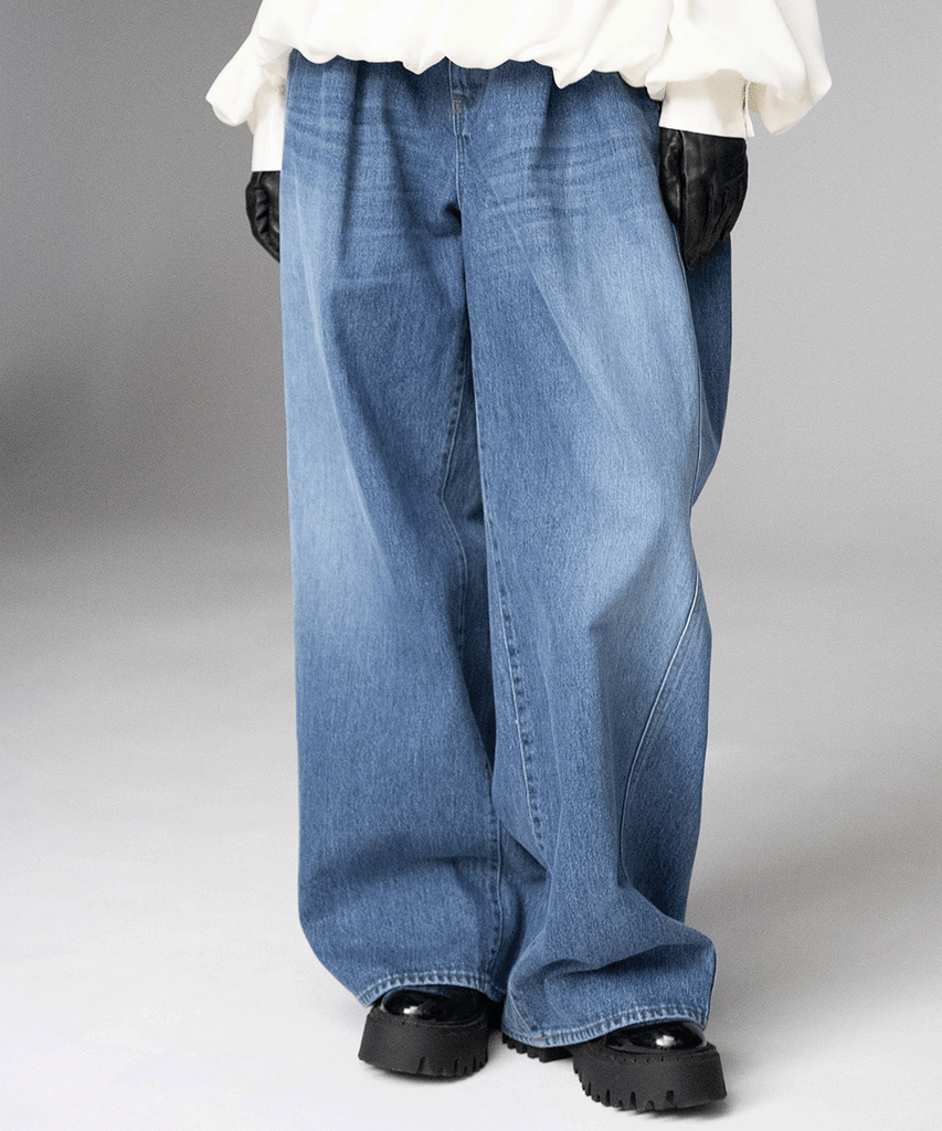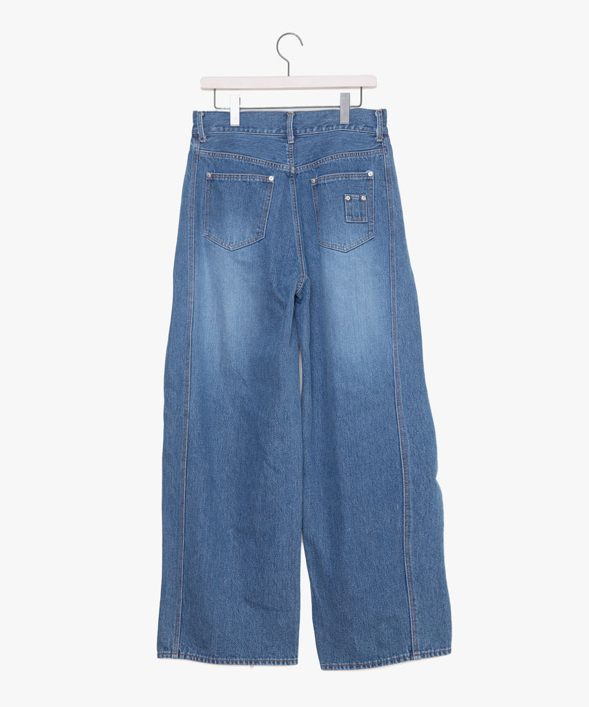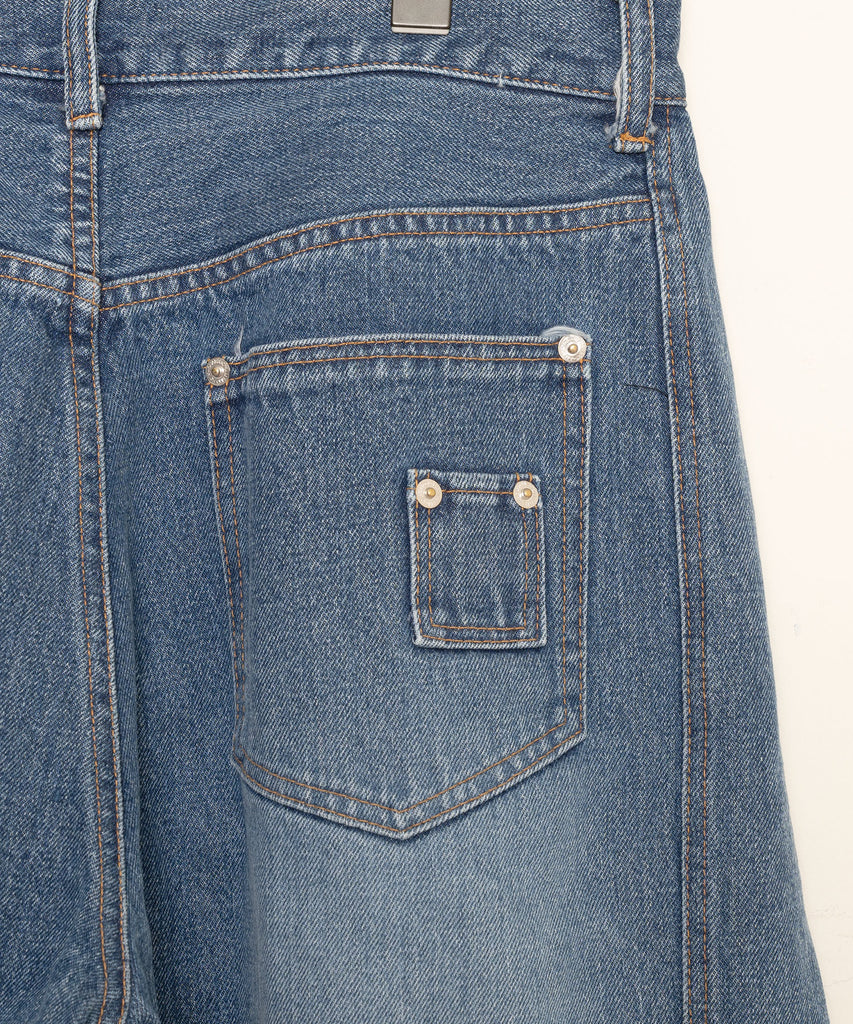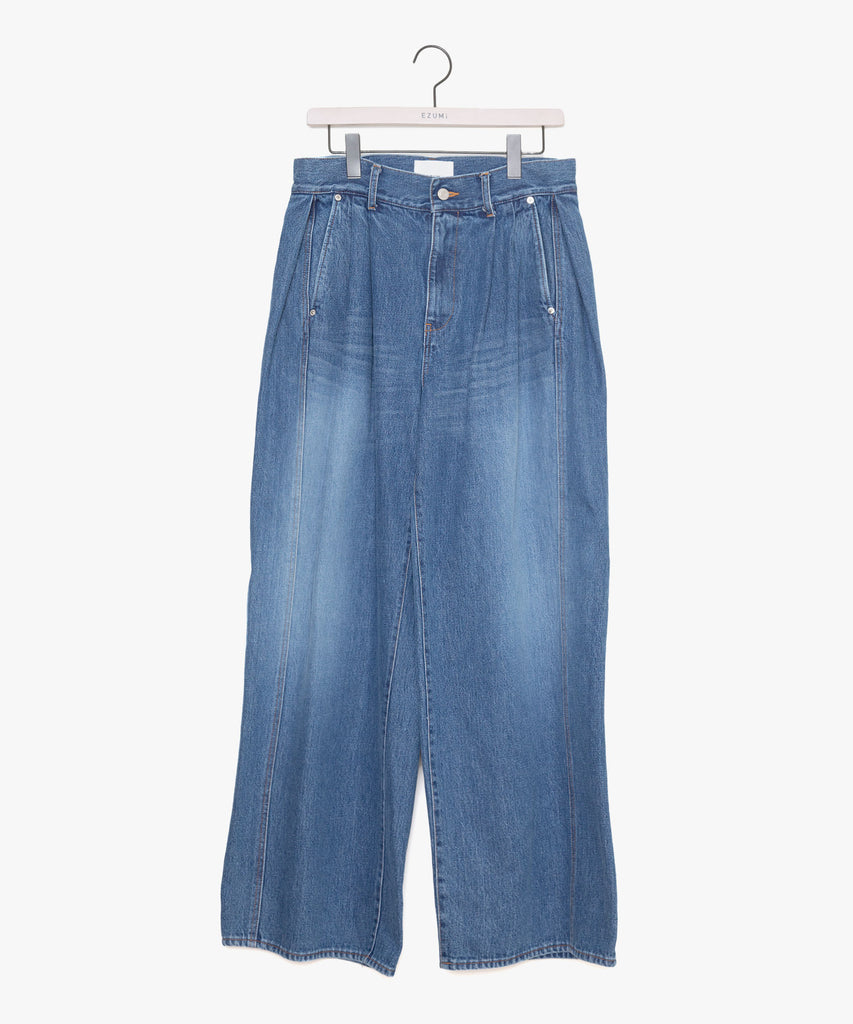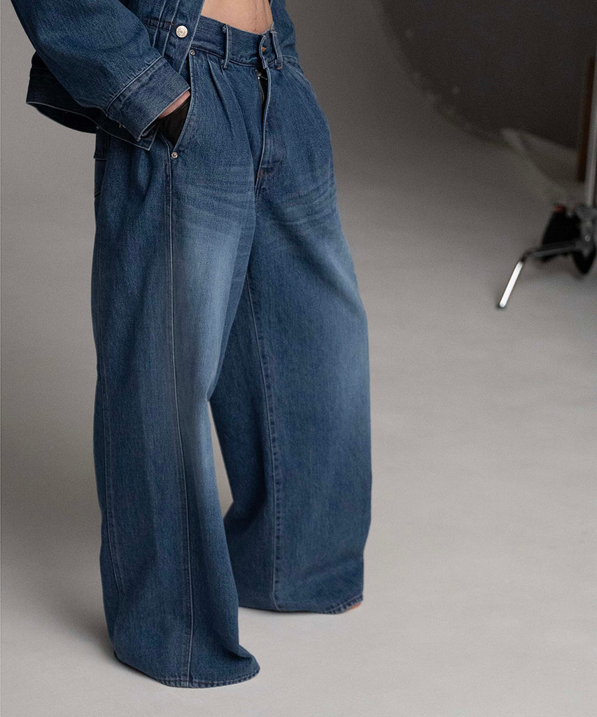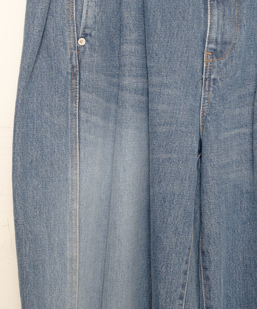 サイドに施されたタックが、ワイドなシルエットに立体感と動きを生み出し、デニムのカジュアルさにエレガントな印象をプラス。表面に凹凸のあるデニム素材は、ヴィンテージ感とナチュラルな風合いを演出し、13オンスの厚みがしっかりとした作りで、長く愛用できる着心地の良さを提供します。 この独特のシルエットは、他にはない個性を引き出し、デイリーから特別なシーンまで、幅広いスタイリングを楽しむことができる一着です。