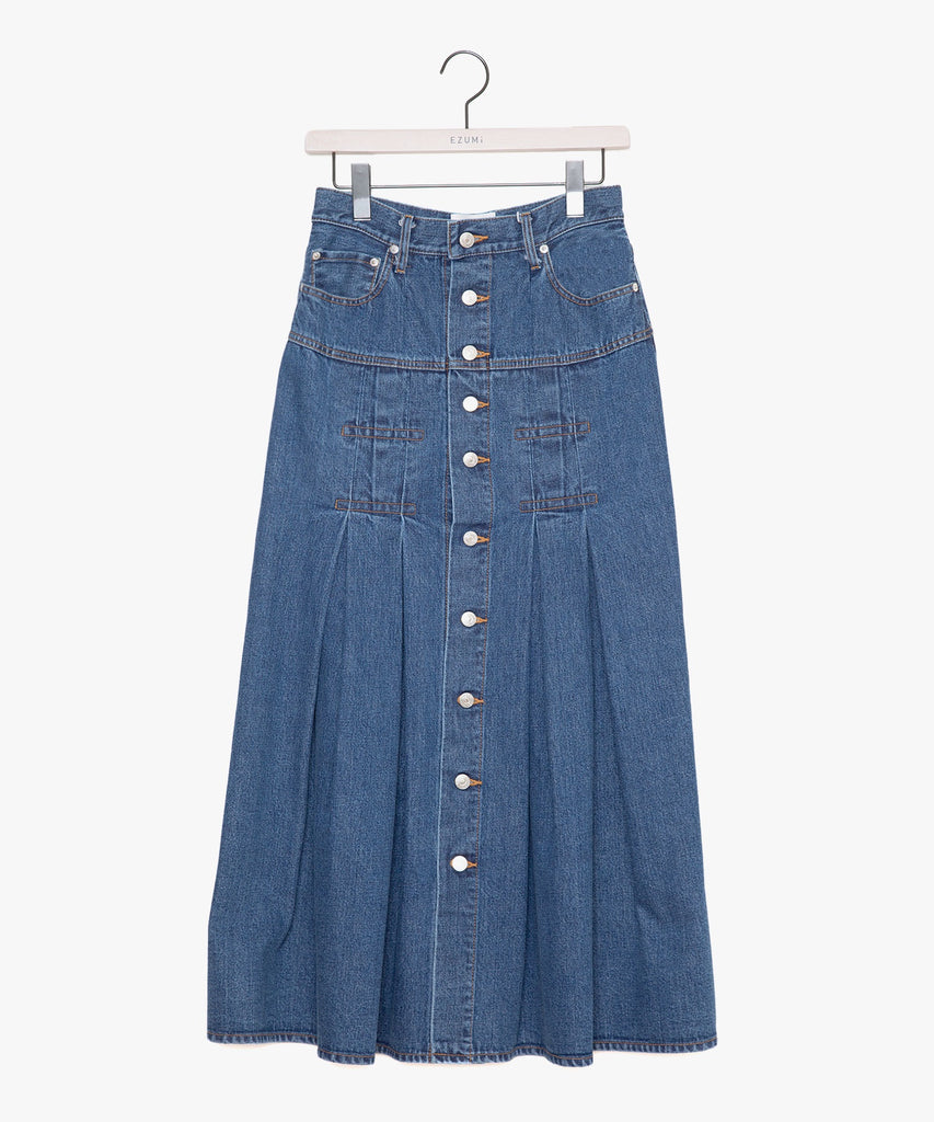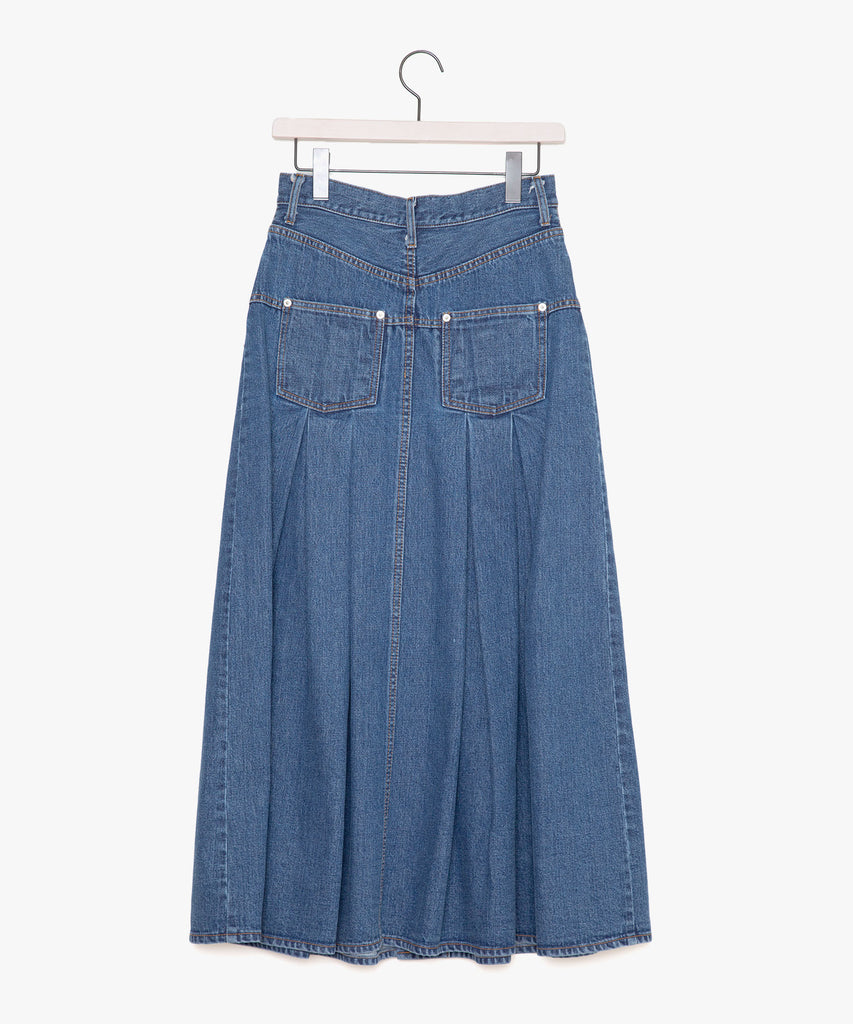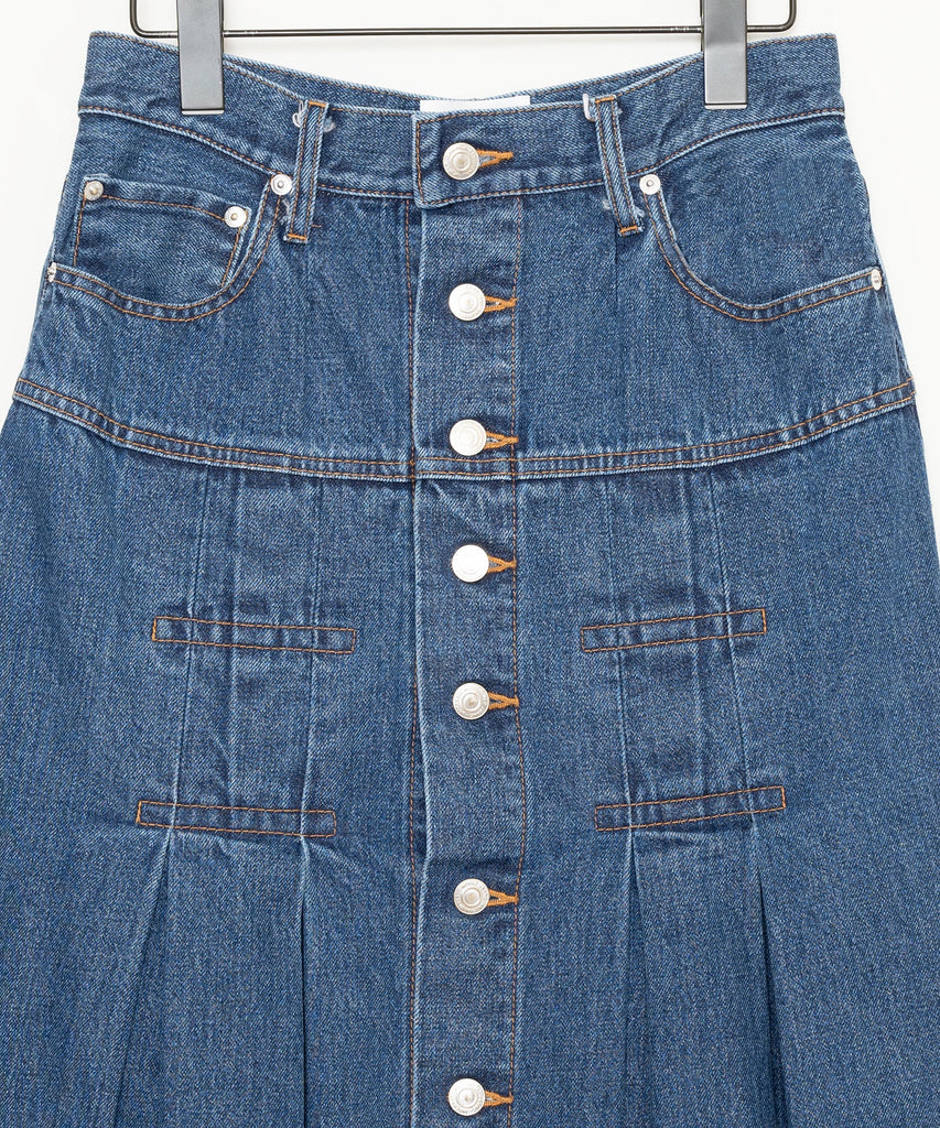 クラシックなディテールにモダンなエッセンスを融合させたデニムスカートは、25SSのテーマ『風刺的なエレガンス』『真面目にふざける』を反映し、遊び心あふれるディテールが特徴です。デニムジャケット1stの象徴的なプリーツデザインが取り入れられており、スタイルに立体感と奥行きを加えています。 タックによるシルエットが、デニムのカジュアルな雰囲気に上品さをプラスし、動きに美しさを演出。表面に凹凸があり、ヴィンテージ感とナチュラルな素材感が際立つデニム素材を使用しており、13オンスの厚みがしっかりとした作りで、着心地が良く長く愛用できる一着です。