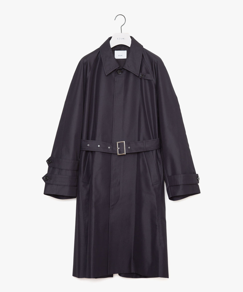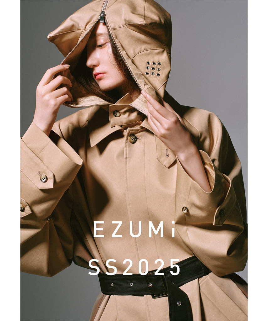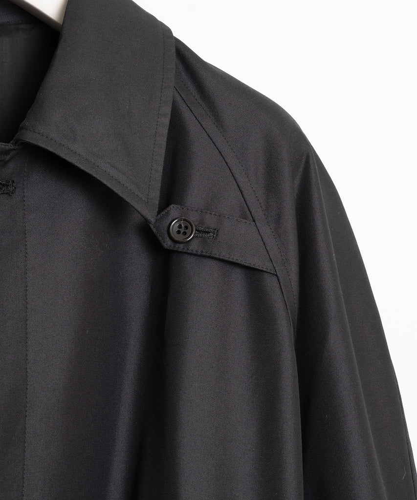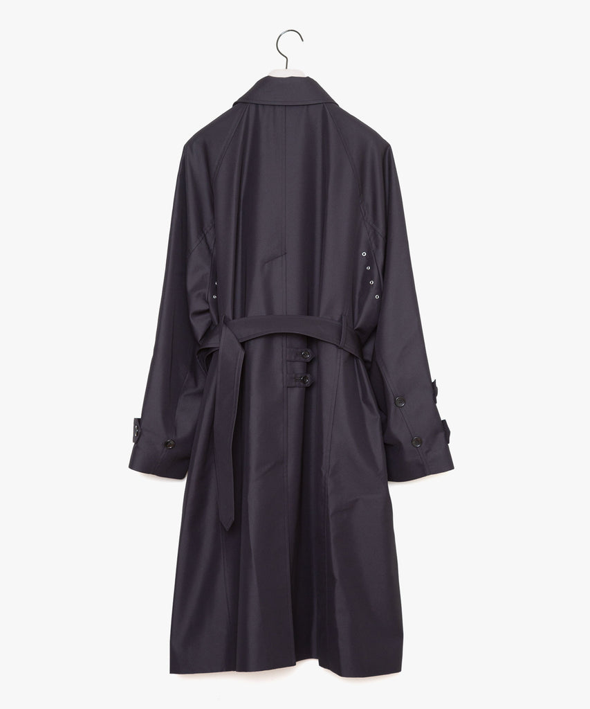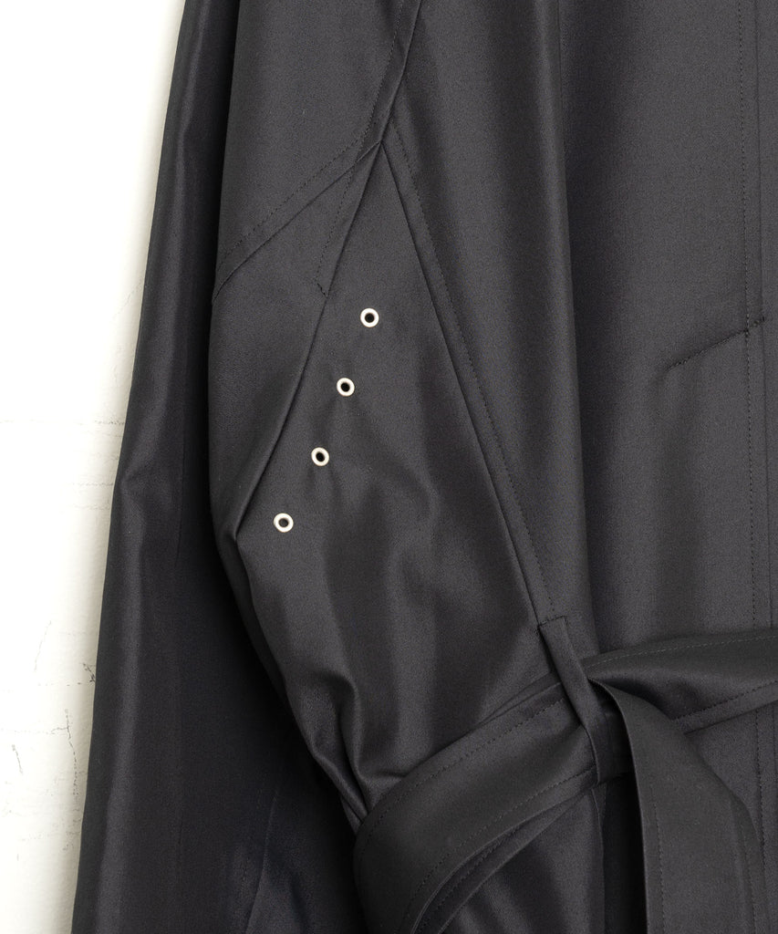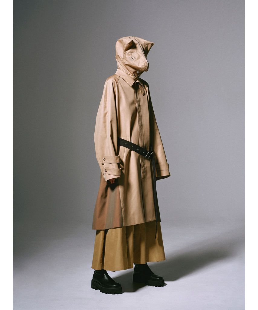 ステンカラーコートのオリジンを徹底的にリサーチし、シルエットに革新的な挑戦を加えました。ラグランスリーブにはサングラスをかけるためのタブ、バックプリーツには二つのタブを配置し、右袖には二本のベルトを取り入れることで、リュクスなデザインにプリミティブな要素を加えています。さらに、袖下に施されたハトメは通気性を確保しながら、機能性とデザインの両立を図っています。