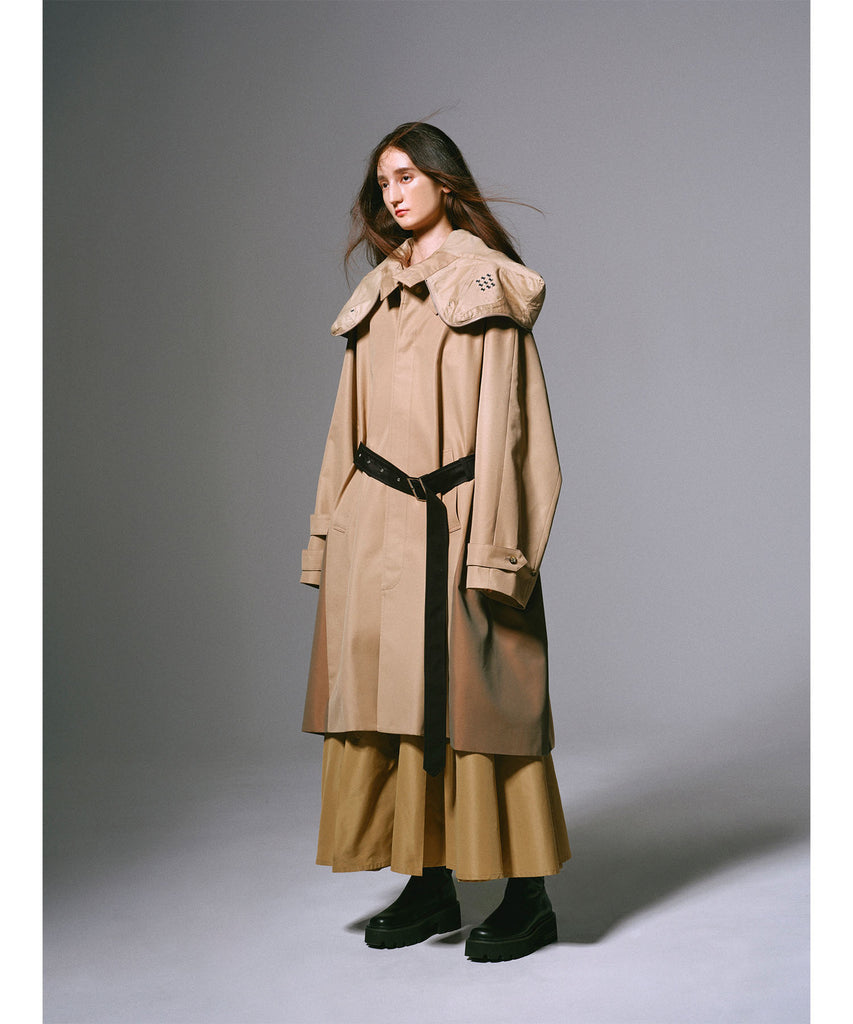 洗練されたバイカラーが際立つラグジュアリーなステンカラーコート。ジェンダーレスなデザインで、ユニセックス型3サイズ展開しています。25SSコレクションのテーマである「風刺的なエレガンス」と「真面目にふざける」を具現化し、エレガントでありながら遊び心を忘れないディテールを随所に散りばめました。