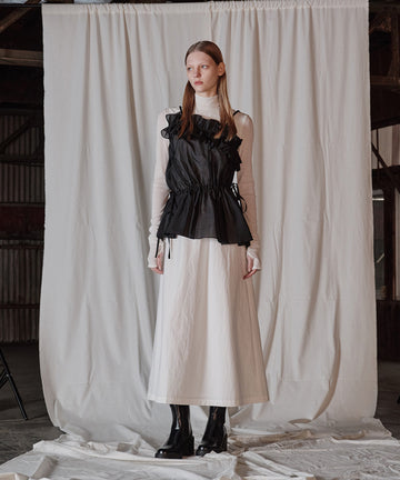 ビスチェ部分は上質な光沢感とナチュラルなシボ感が特徴のシアー素材を使用。