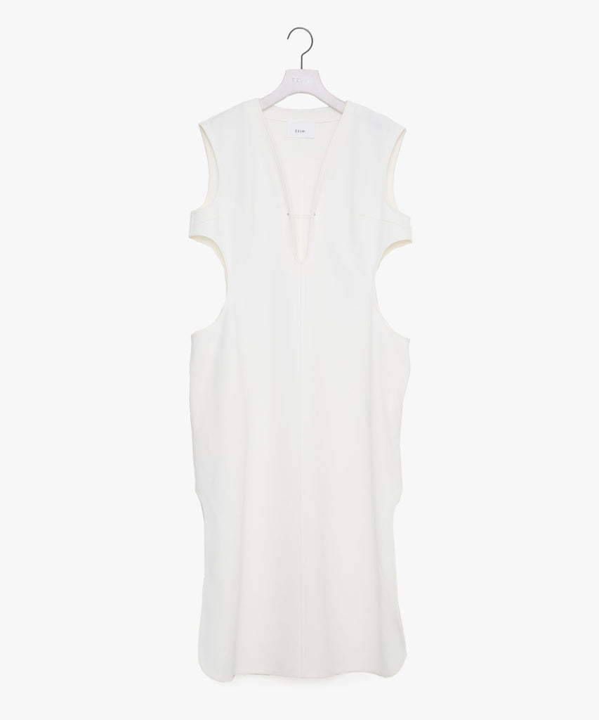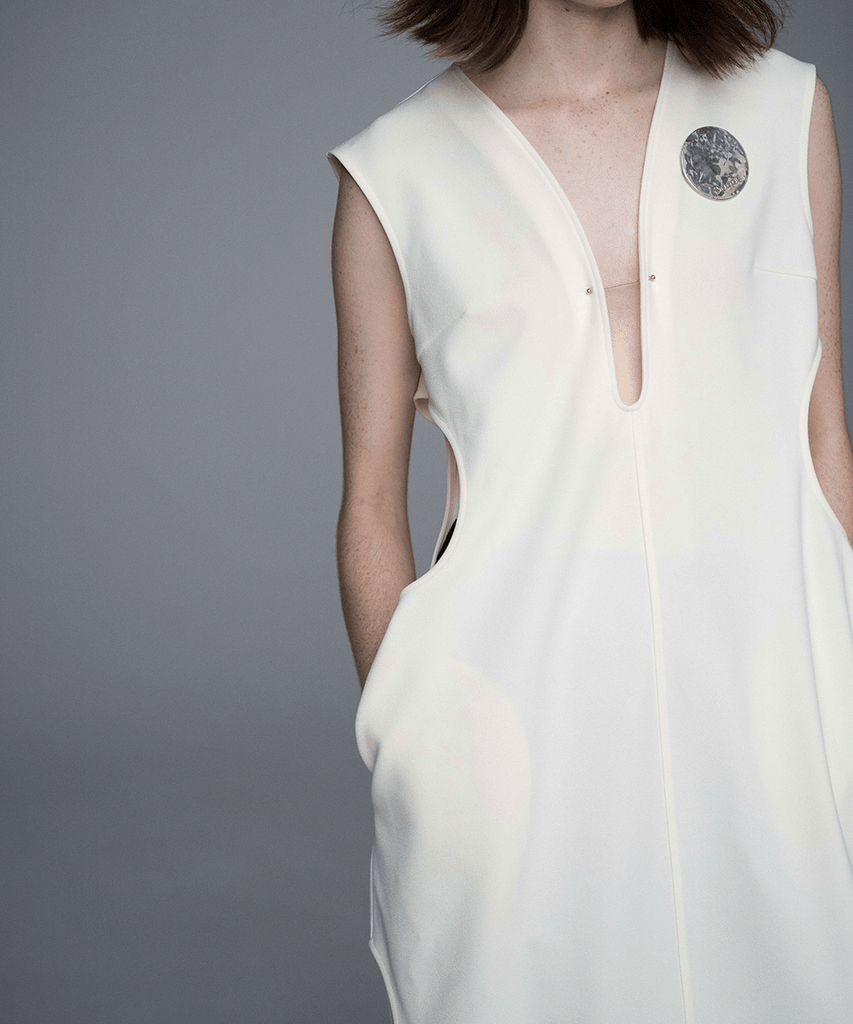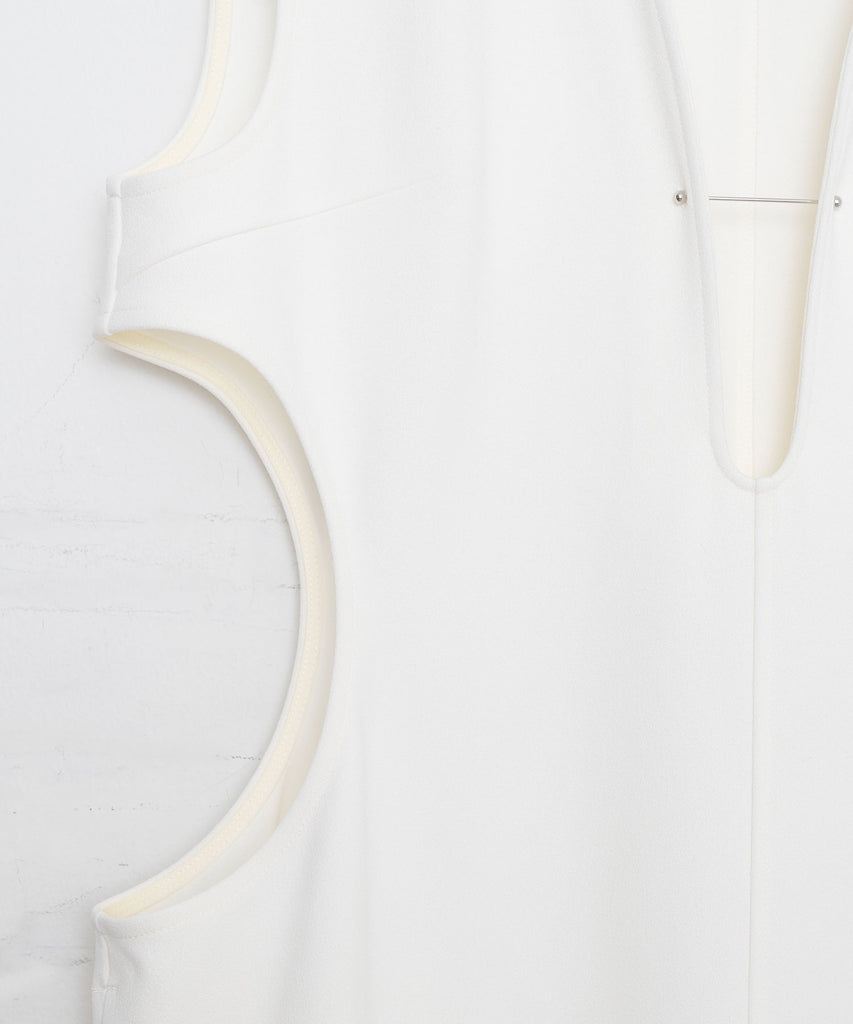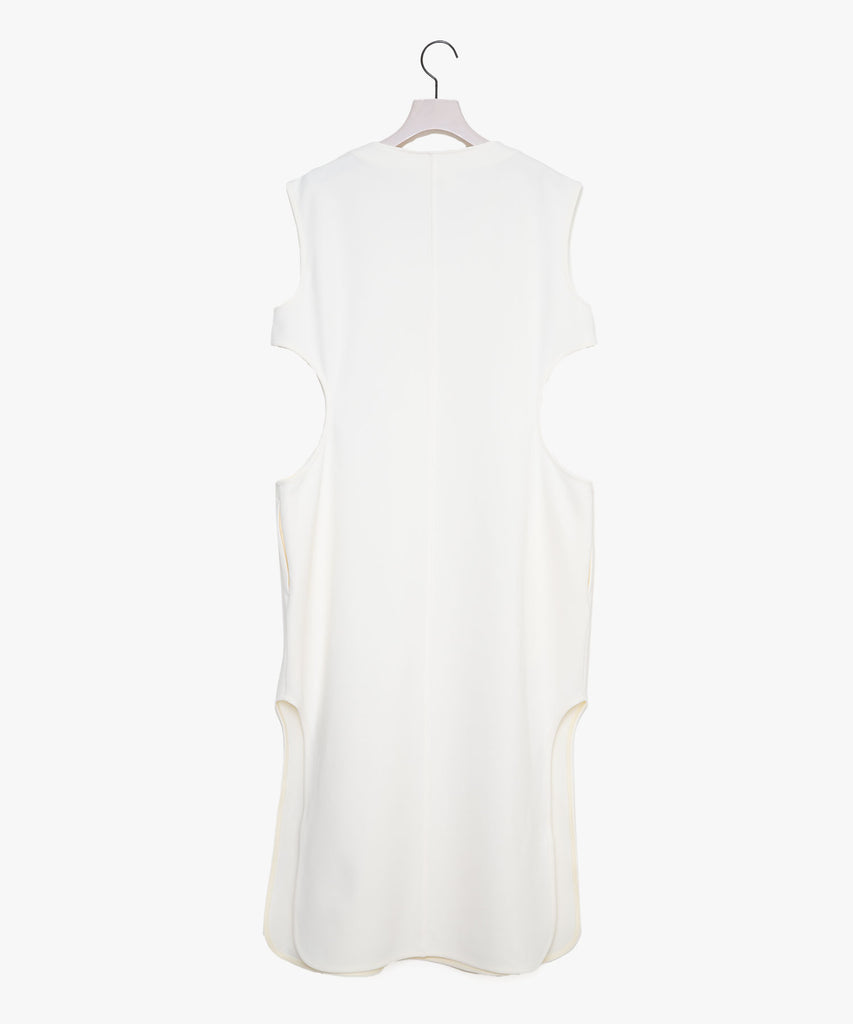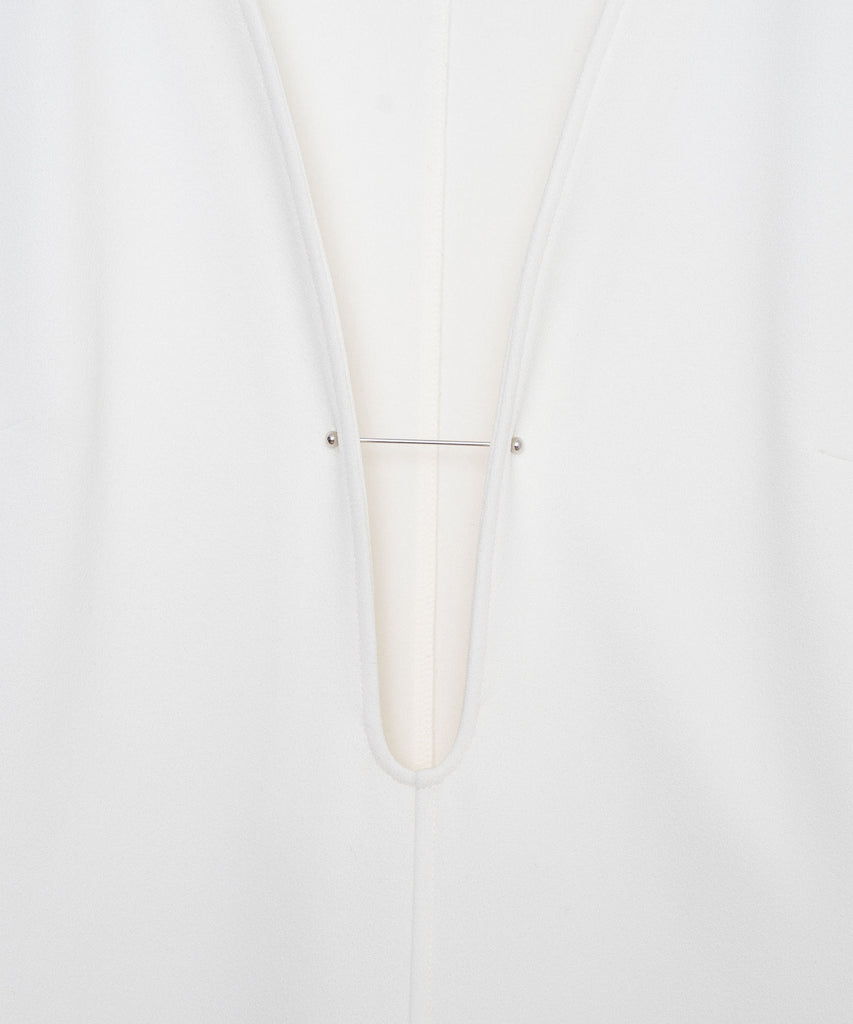 デザイン性と遊び心が際立つこのサークルカッティングカットソージレは、25SSのテーマ『風刺的なエレガンス』『真面目にふざける』を反映したユニークな一着です。ウエスト部分に施された丸いカッティングが独特のシルエットを生み出し、軽やかな印象を与えています。胸元の菊穴に通されたカラーピンが、個性的でユニークなアクセントとなり、スタイリングに遊び心をプラスしています。