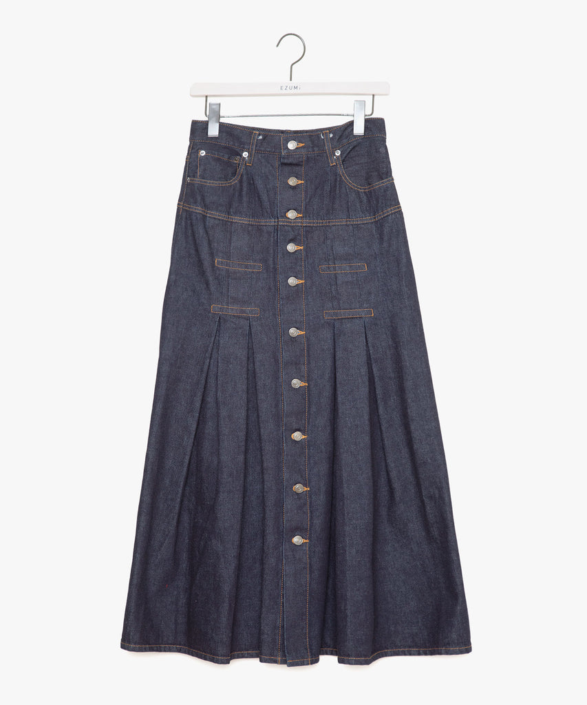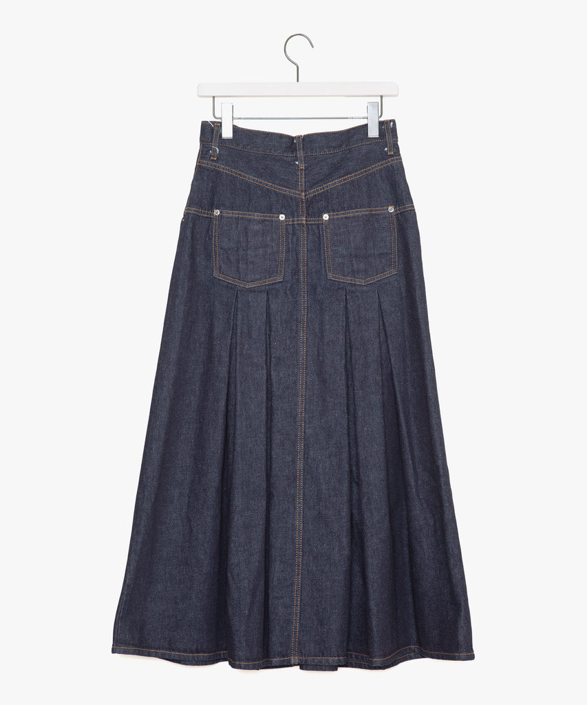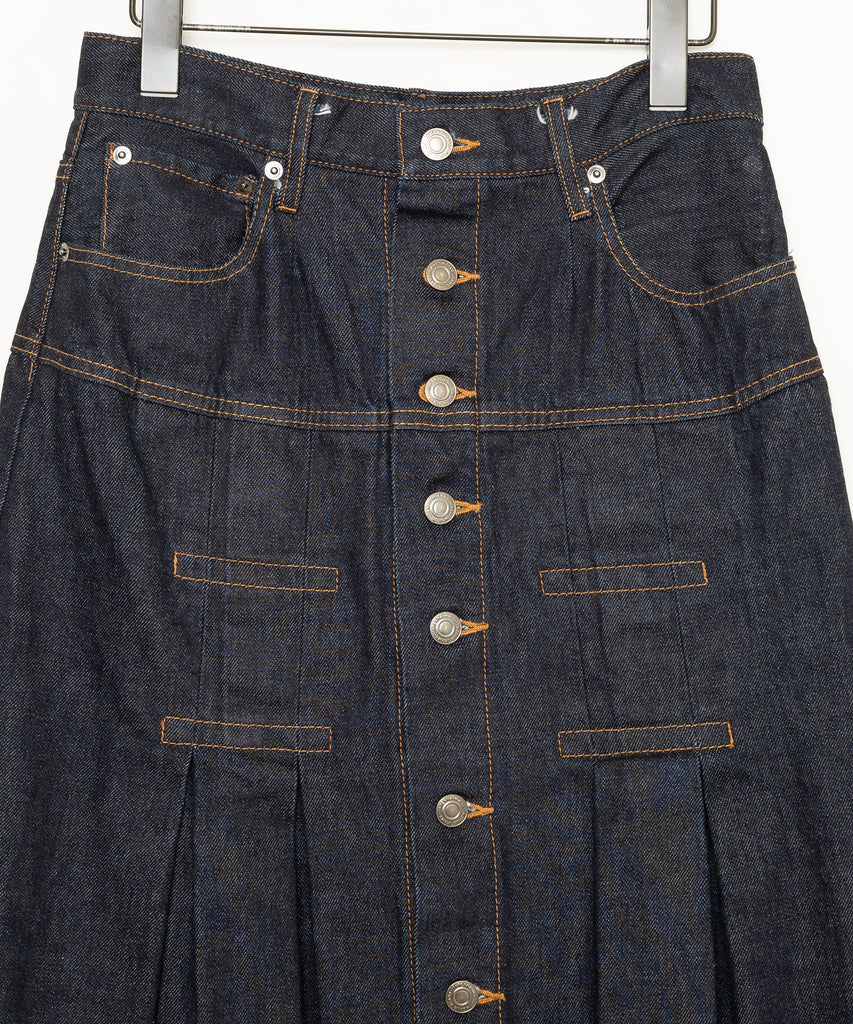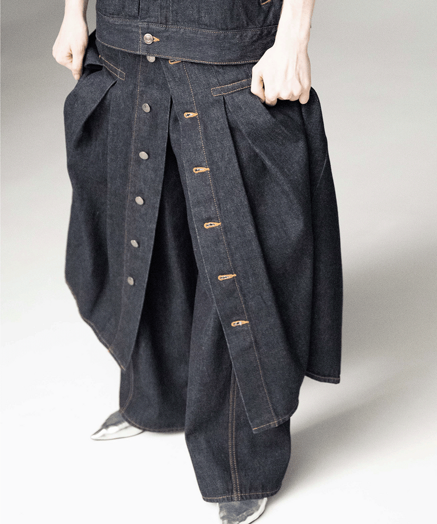クラシックなディテールにモダンなエッセンスを融合させたデニムスカートは、25SSのテーマ『風刺的なエレガンス』『真面目にふざける』を反映し、遊び心あふれるディテールが特徴です。デニムジャケット1stの象徴的なプリーツデザインが取り入れられており、スタイルに立体感と奥行きを加えています。 タックによるシルエットが、デニムのカジュアルな雰囲気に上品さをプラスし、動きに美しさを演出。表面に凹凸があり、ヴィンテージ感とナチュラルな素材感が際立つデニム素材を使用しており、13オンスの厚みがしっかりとした作りで、着心地が良く長く愛用できる一着です。
