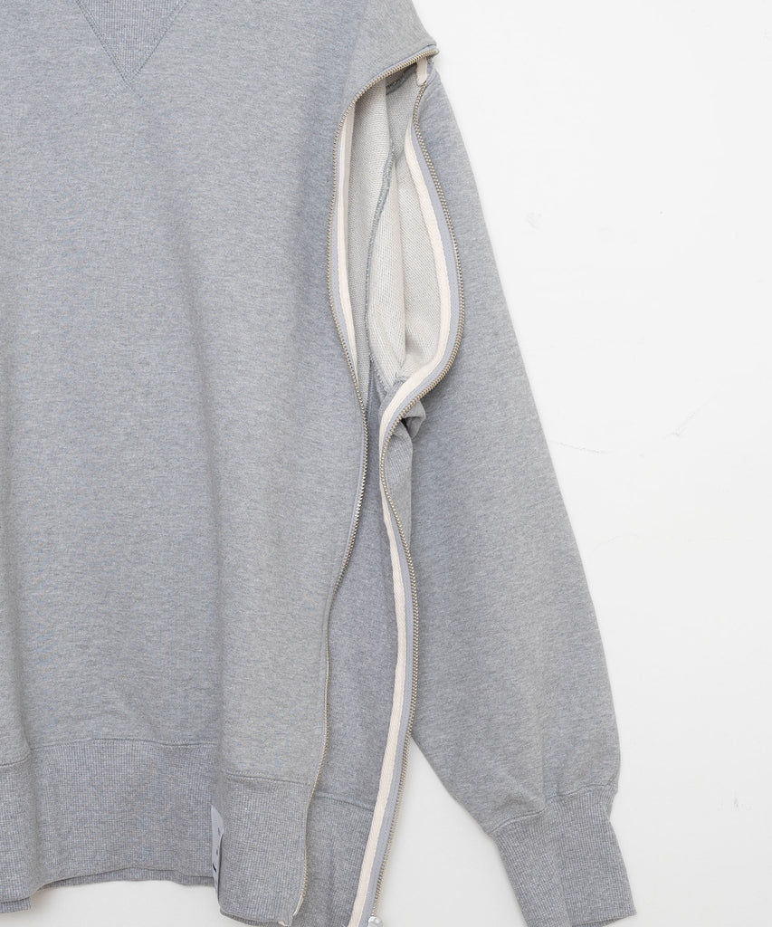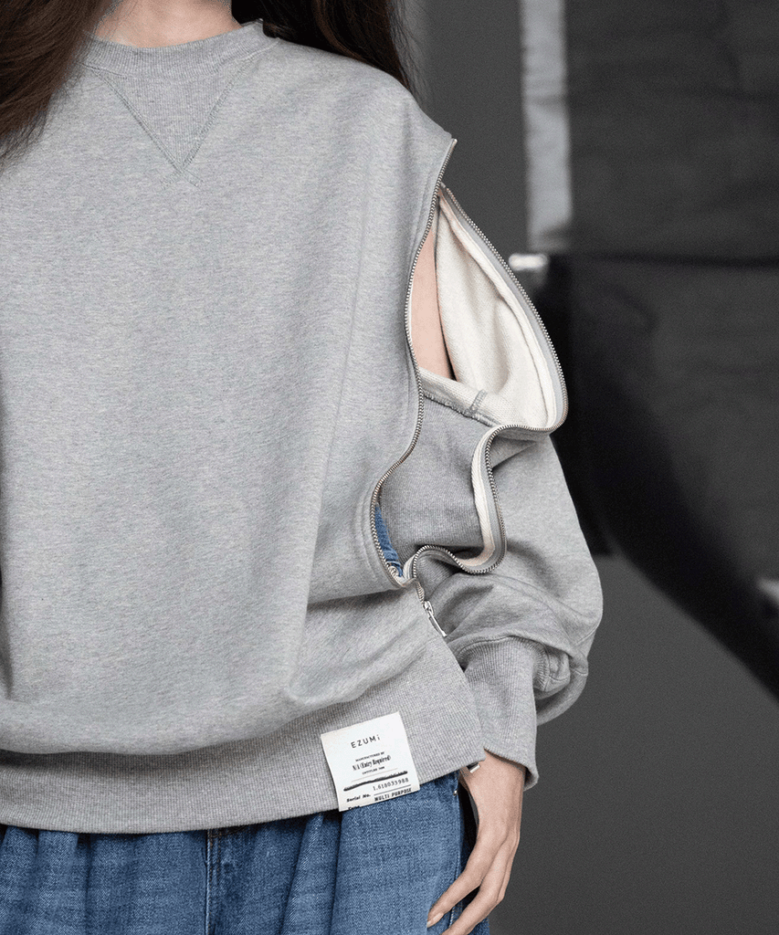 シンプルさと大胆さを兼ね備えたこのユニークなデザインスウェットは、片袖にファスナーが付いており、開けることで肩を大胆に見せることができる仕様が魅力です。ファスナーを閉じれば、スタンダードなスウェットスタイルとしても楽しめるため、さまざまなシーンに対応できます。
