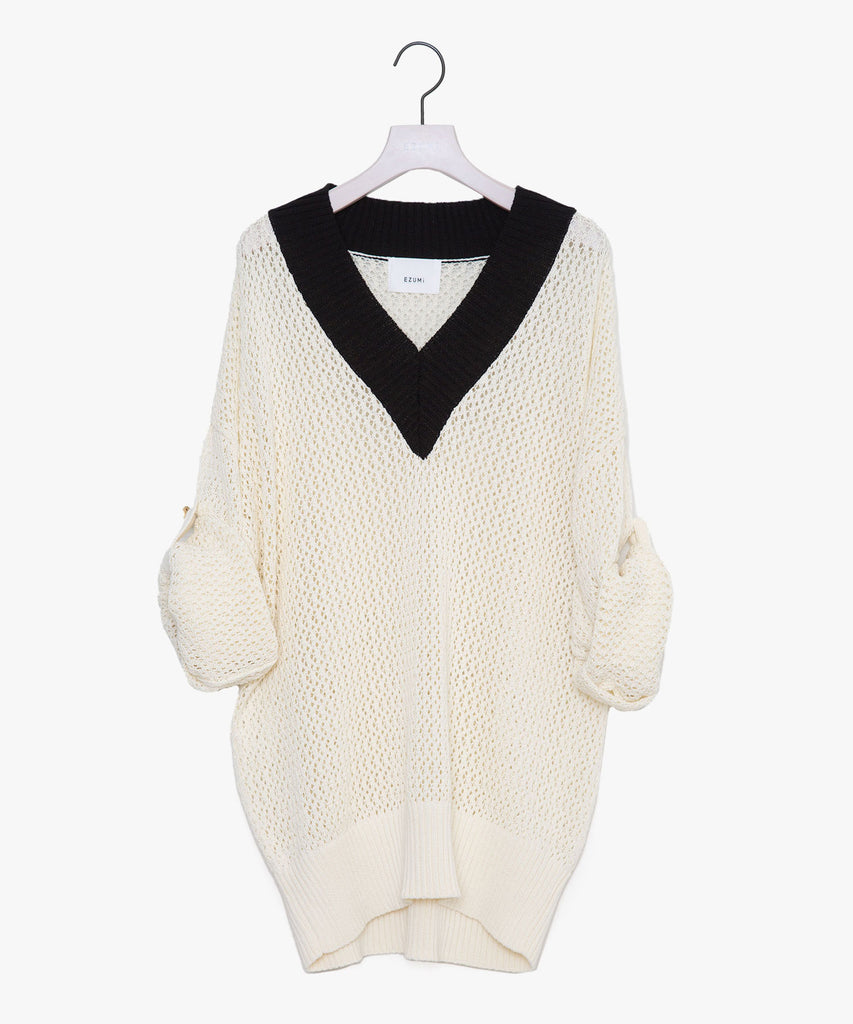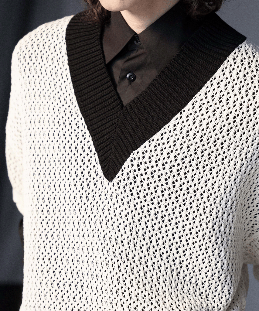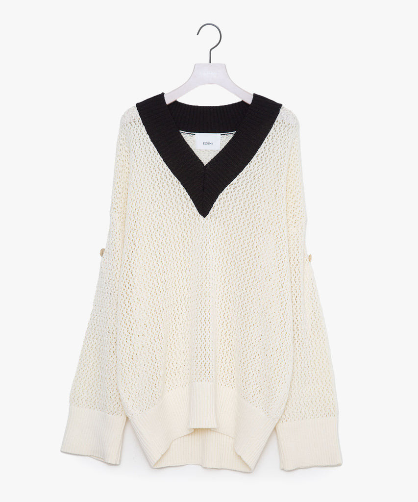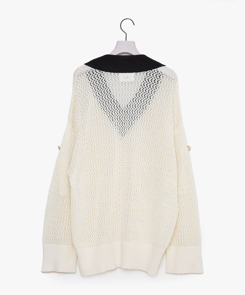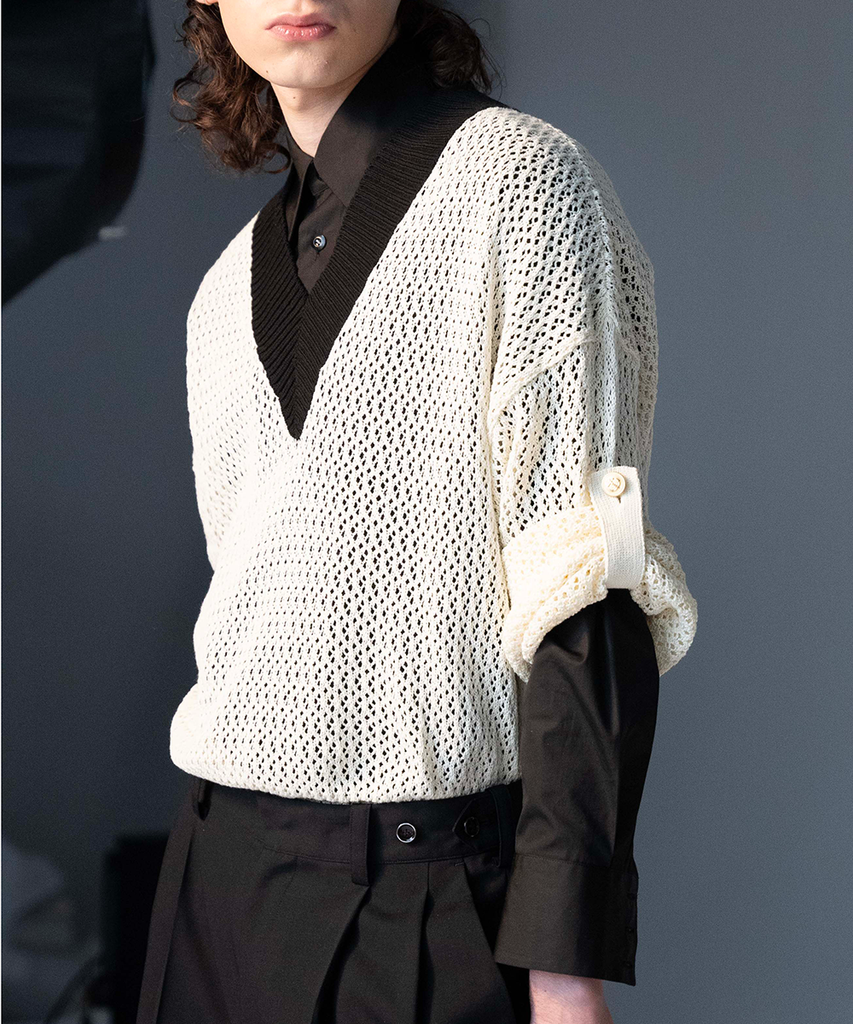洗練されたデザインと優れた機能性を兼ね備えたこのオーバーサイズメッシュチルデンニットは、軽やかなメッシュ編みが特徴で、通気性が良く、暑い季節でも快適に着用できます。クラシックなデザインに配色ラインを施し、モダンでスタイリッシュな印象を与えます。 袖は簡単にロールアップできる機能的なテープとメタルボタンが施されており、スタイリングの幅を広げるアクセントとして活用できます。インナーやパンツとの組み合わせ次第で、カジュアルにもエレガントにも着こなせる、万能なアイテムです。