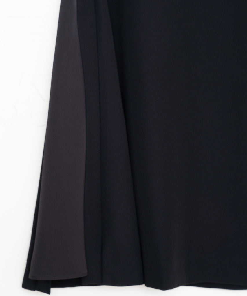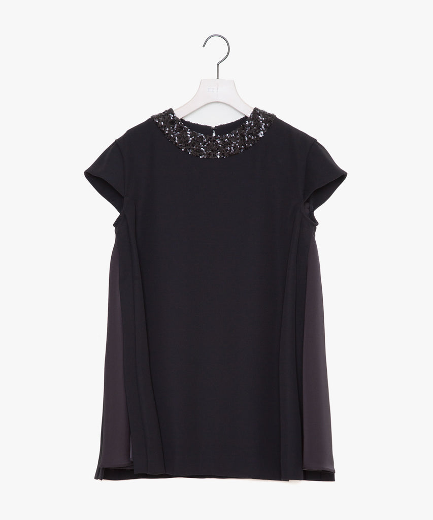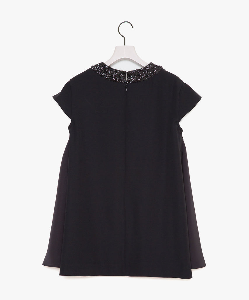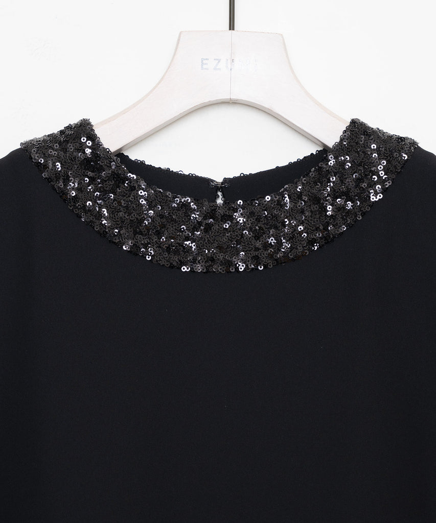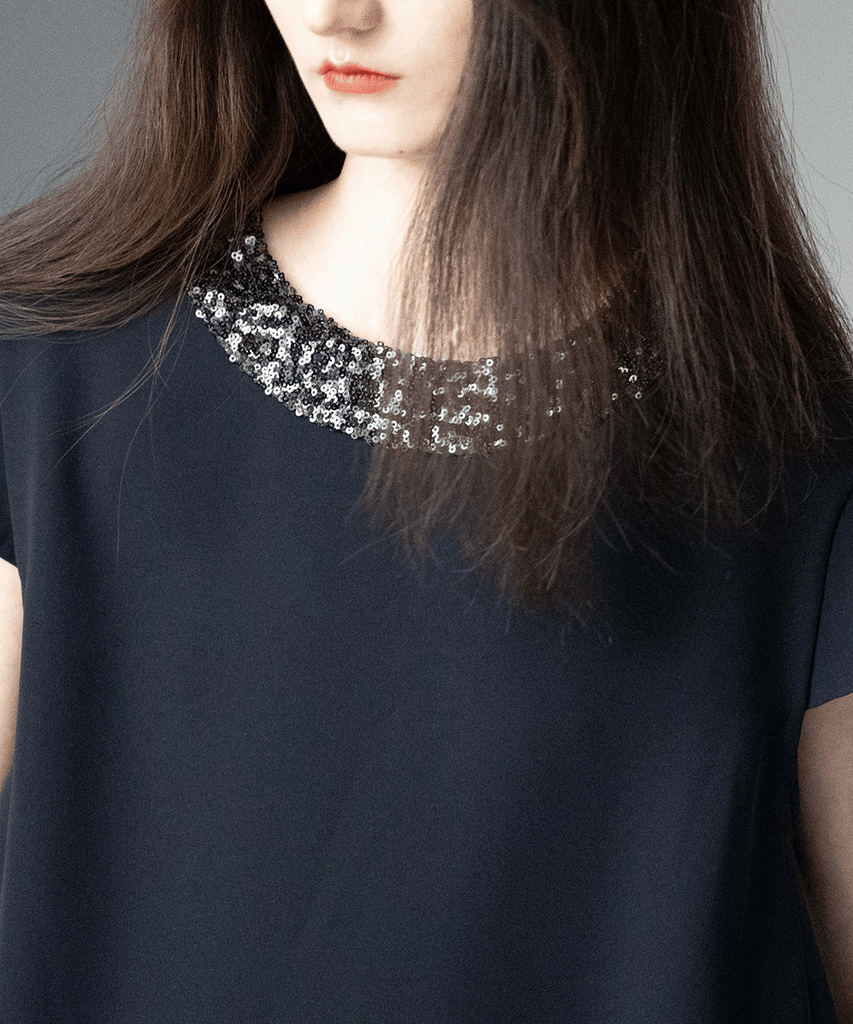 首元に施されたスパンコールが印象的なこのAライントップスは、リトルブラックドレスからインスパイアされたディテールが特徴です。スパンコールが顔まわりを明るく引き立て、エレガントなアクセントを加えています。Aラインシルエットが女性らしい美しいラインを強調し、動きに合わせて軽やかに揺れるダブルサテンストレッチのドレープ感が、優雅で洗練された印象を与えます。 サイドには切り替えが施されており、シルク調の上質なサテン素材が使用されているため、さりげない光沢が上品さをプラス。カジュアルなシーンからオケージョンまで、幅広いシチュエーションで活躍する一着に仕上がっています。