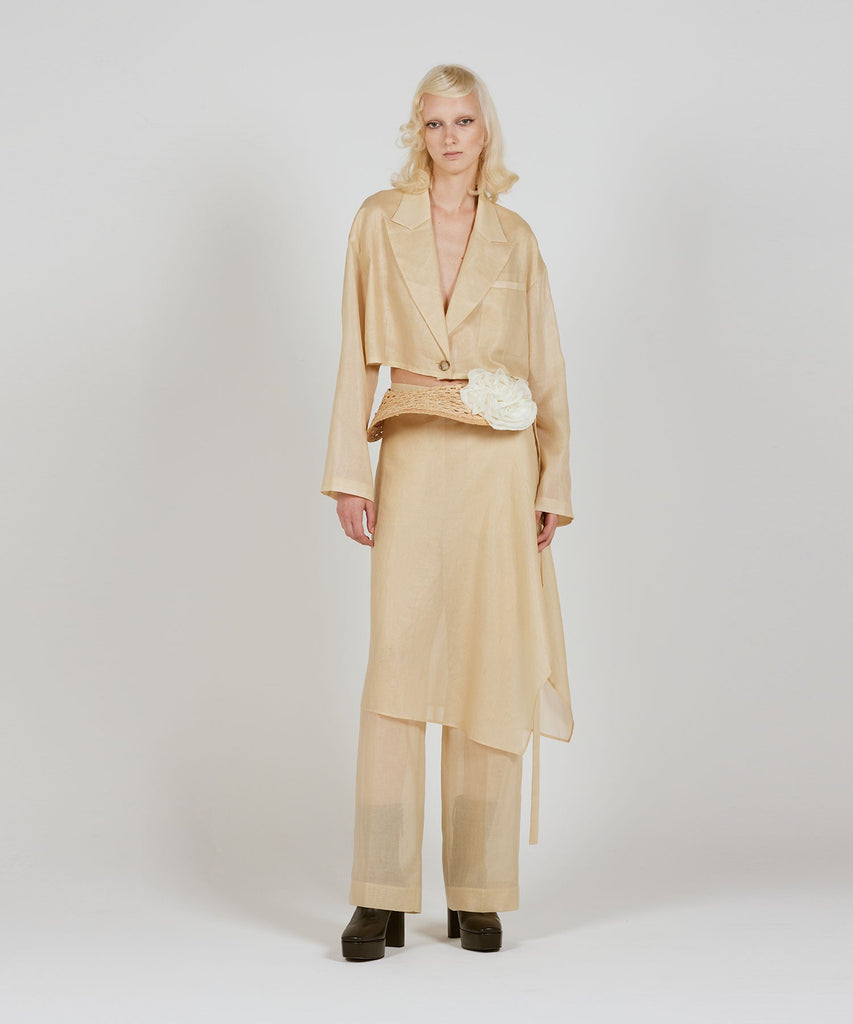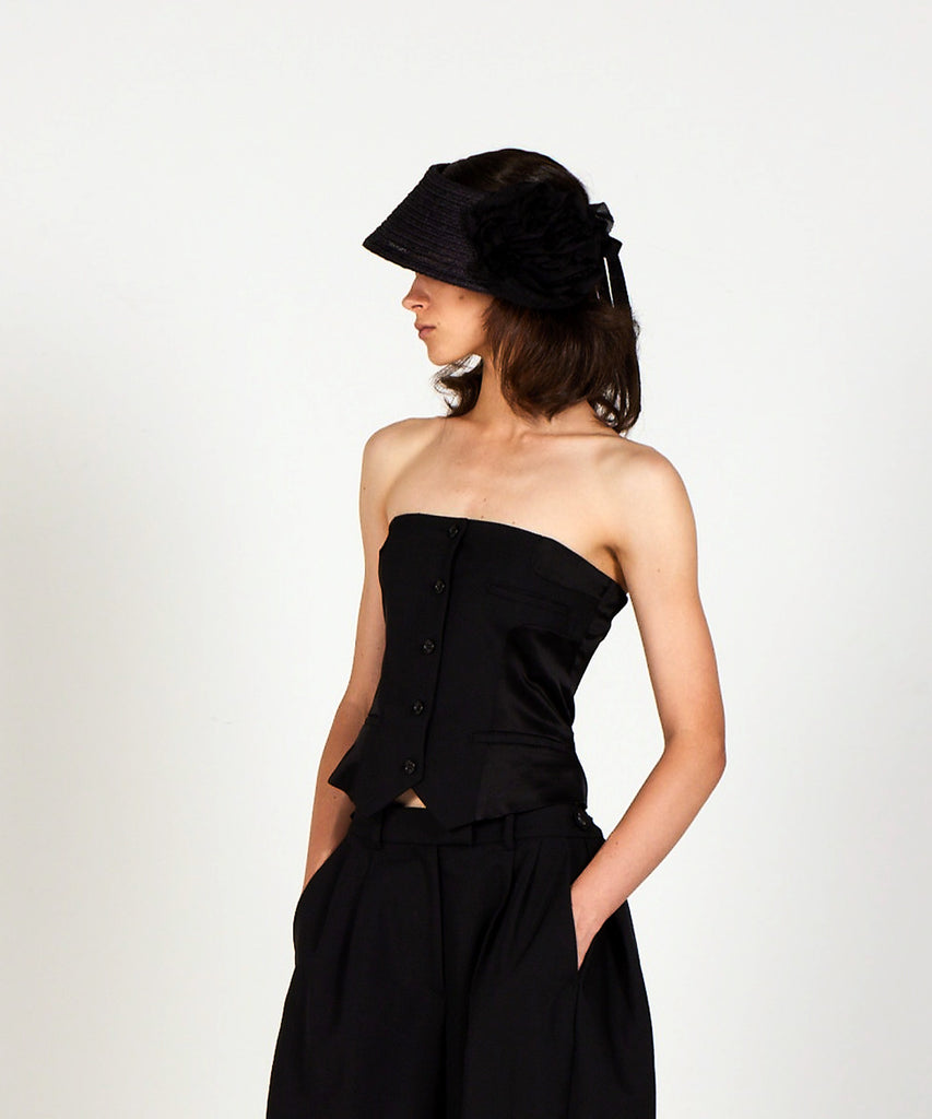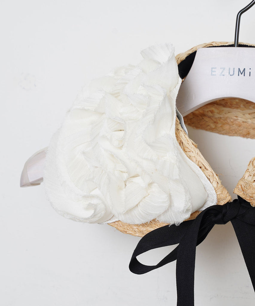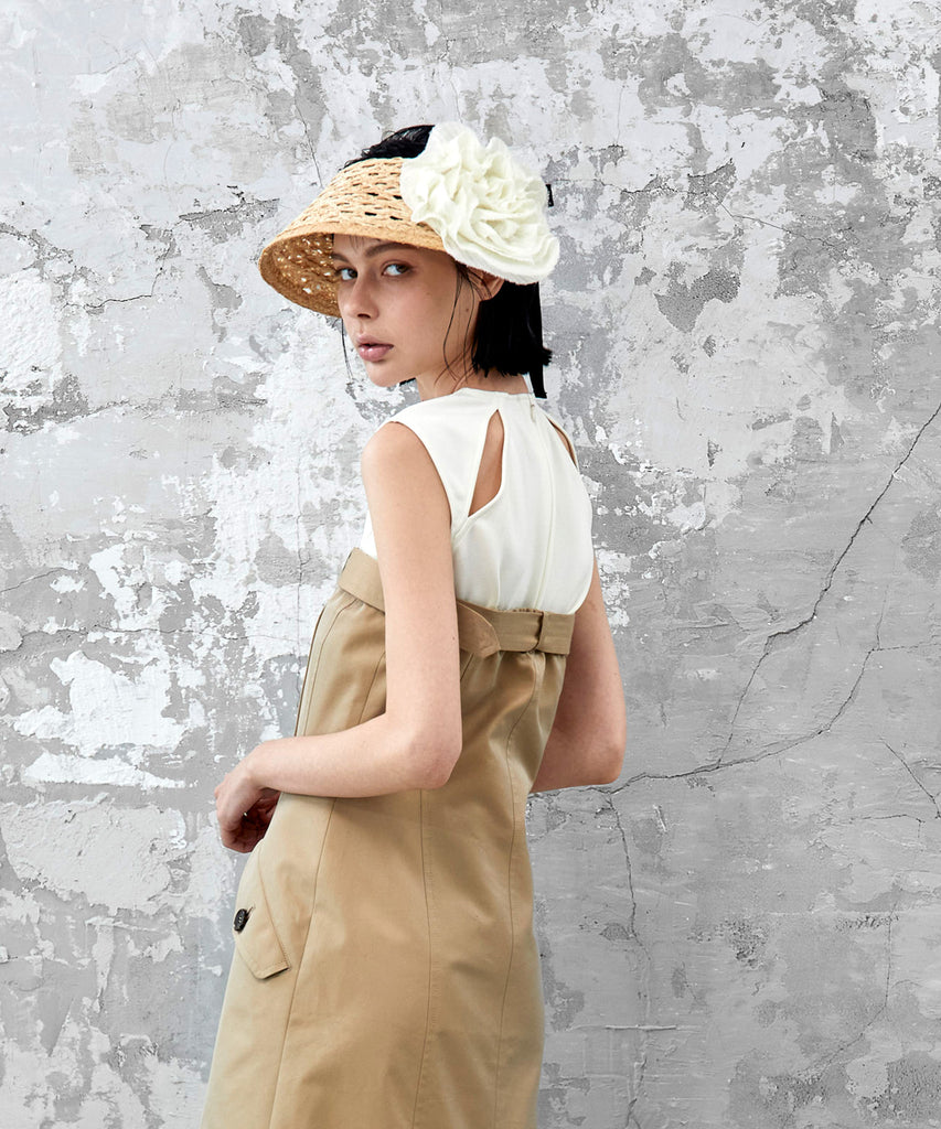 帽子ブランド「La Maison de Lyllis」と「EZUMi」のコラボアイテムです。サンバイザーとしてのほか、付け襟やベルトとしても使用でき、様々なスタイリングが楽しめるようになっています。天然草木の本体にEZUMi オリジナルテープ刺繍のコサージュを組み合わせることで、上品でエレガントな印象になります。コサージュは取り外し可能で、それぞれ別々でも着用できます。